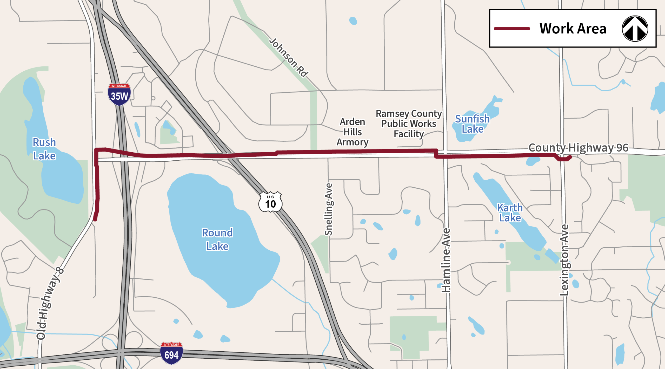 Xcel Energy will replace approximately one mile of natural gas line in Arden Hills, Shoreview, and New Brighton, Minnesota as the first phase of the Highway 96 Natural Gas Project. Work will occur along Highway 96 West between Lexington Avenue North and Old Highway 8 Northwest, and along Old Highway 8 Northwest between Highway 96 West and 1st Avenue Northwest.